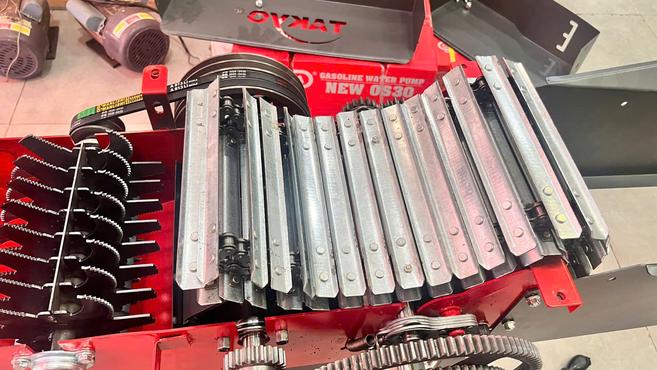 Có phần băng tải sắt chuyển động qua hệ thống dây xích rất chắc chắn và bền – tiết kiệm công sức và tính an toàn cao