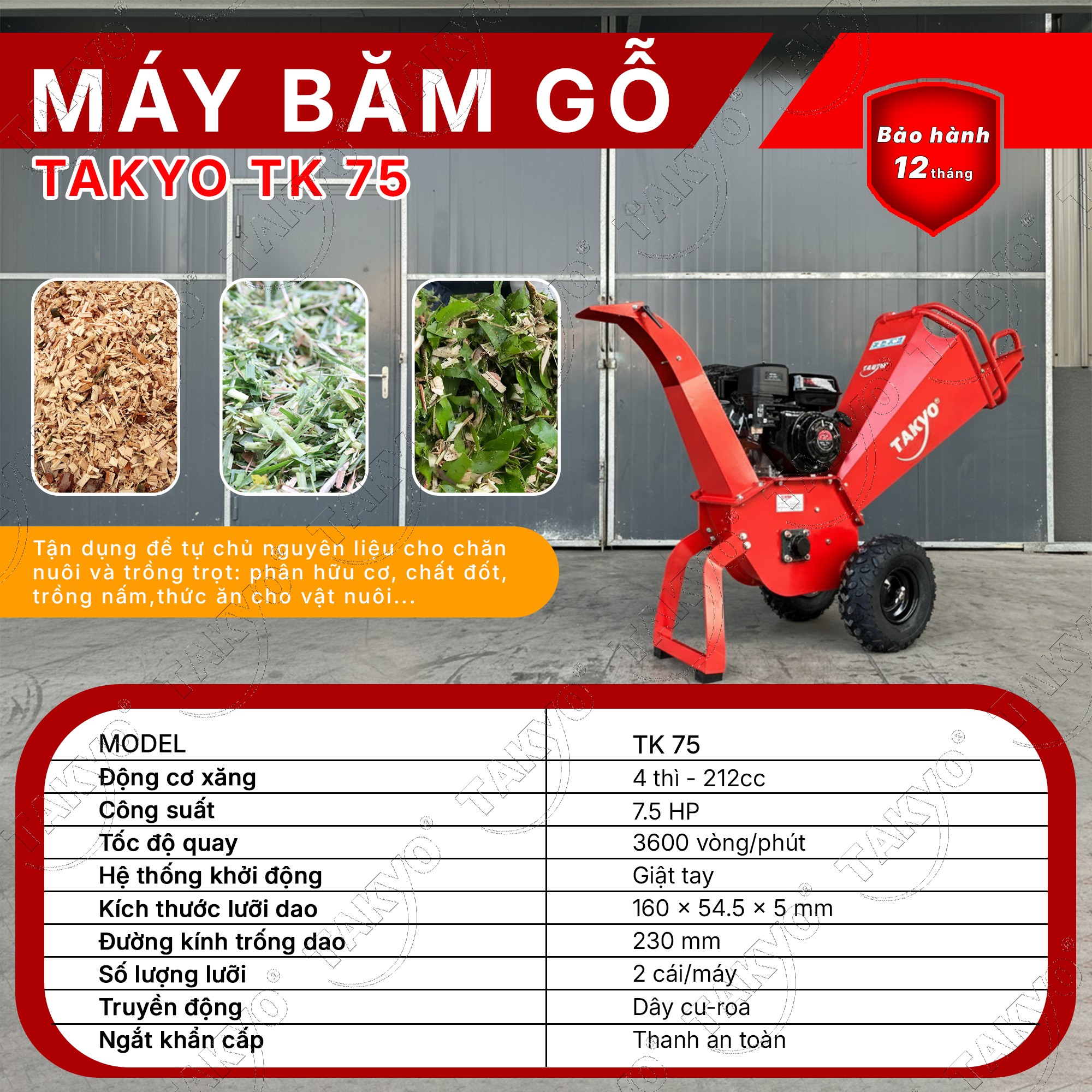 THÔNG SỐ KỸ THUẬT MÁY BĂM GỖ, NGHIỀN CÀNH CÂY DỌN VƯỜN CHẠY XĂNG TAKYO TK 75