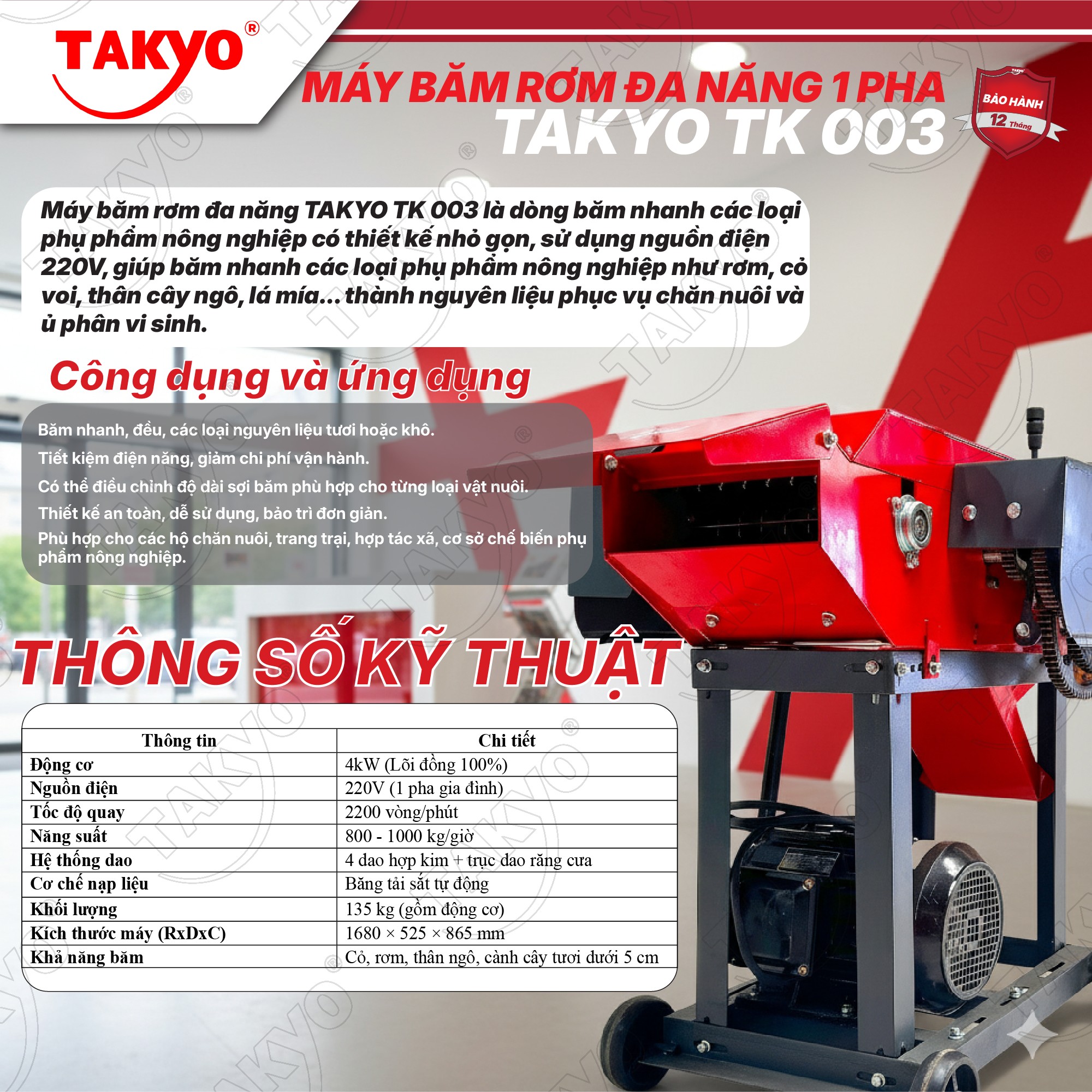 Máy băm rơm TAKYO TK 003 công suất 4kW, 1 pha, đạt năng suất 1 tấn một giờ. Trang bị băng tải tự động, 4 dao thép hợp kim, băm nhỏ thân cây, cỏ voi, rơm rạ nhanh chóng.