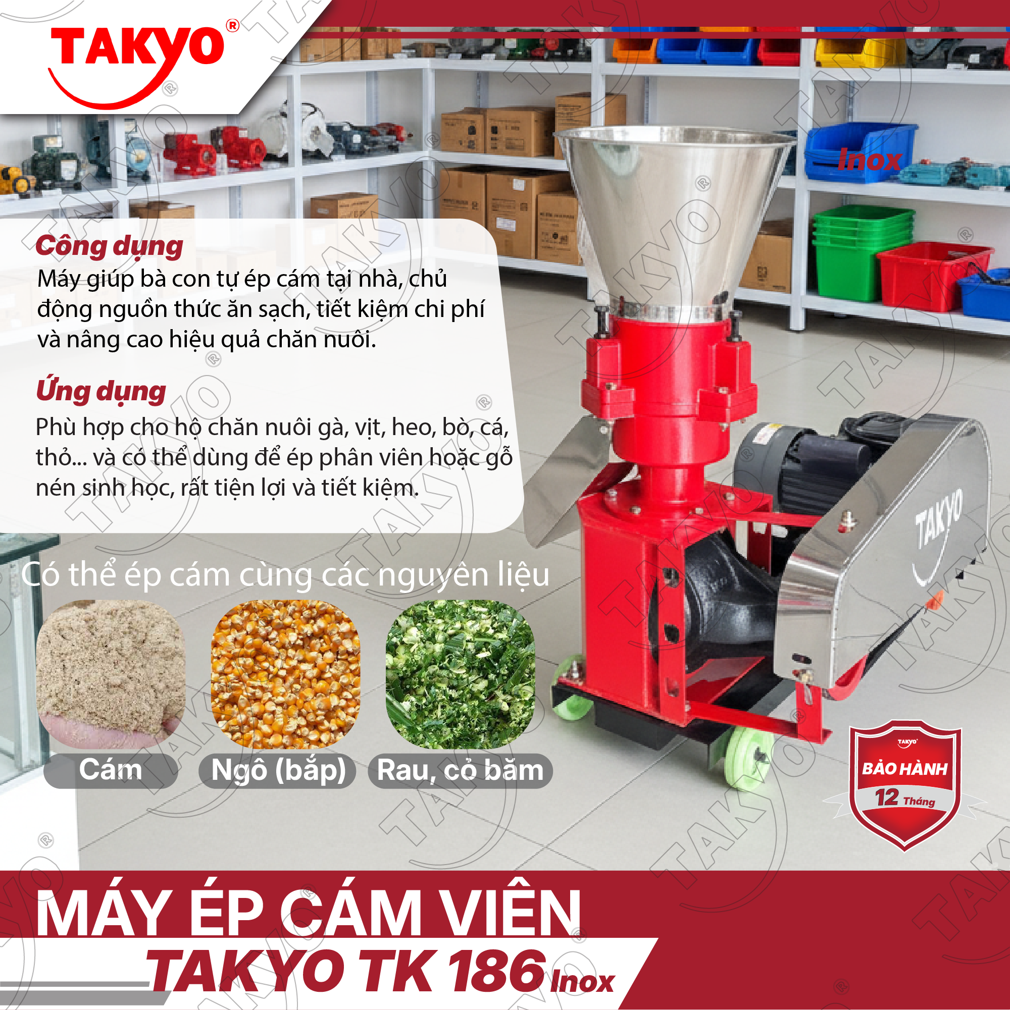 Máy ép cám viên inox TAKYO TK 186 giúp bà con tự sản xuất thức ăn chăn nuôi ngay tại nhà, thay thế hoàn toàn việc mua cám công nghiệp.