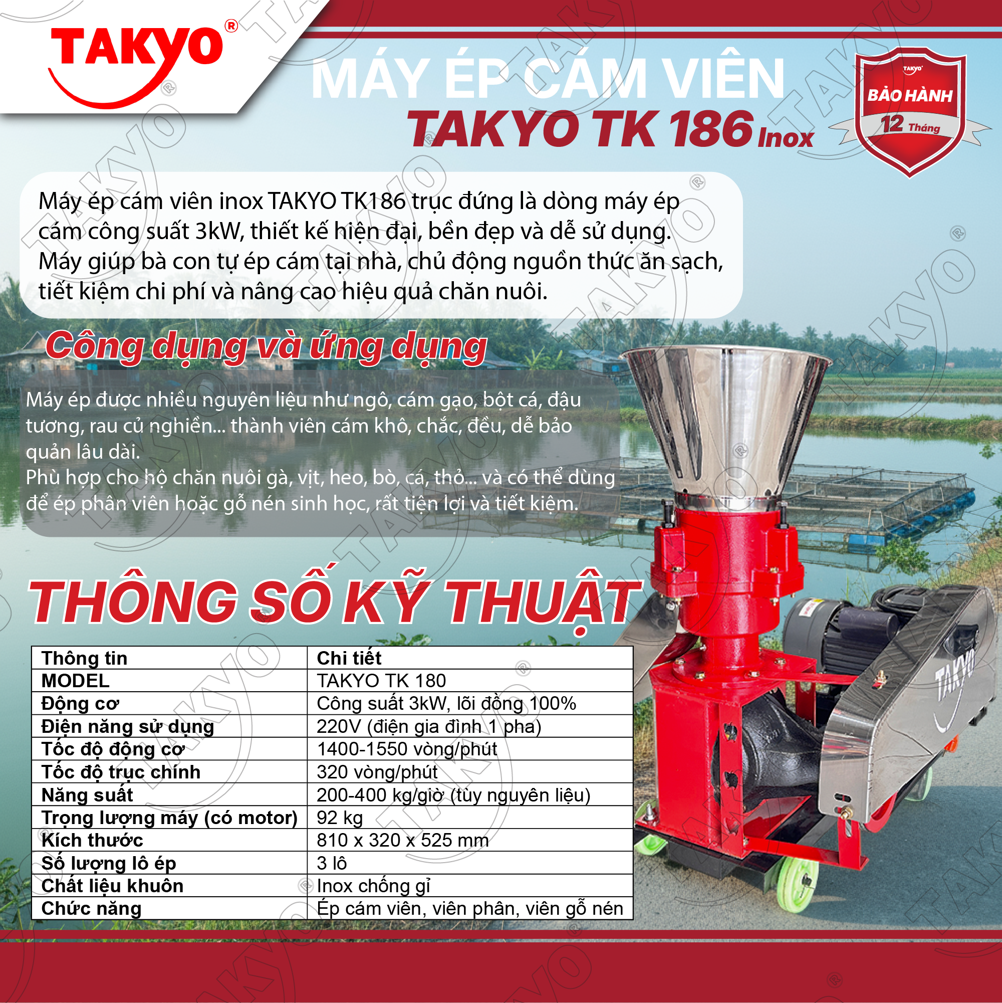 Máy ép cám viên inox TAKYO TK 186 trục đứng là dòng máy ép cám công suất 3kW, sử dụng động cơ dây đồng 100% cho hiệu năng mạnh mẽ, nhanh chóng và ổn định.